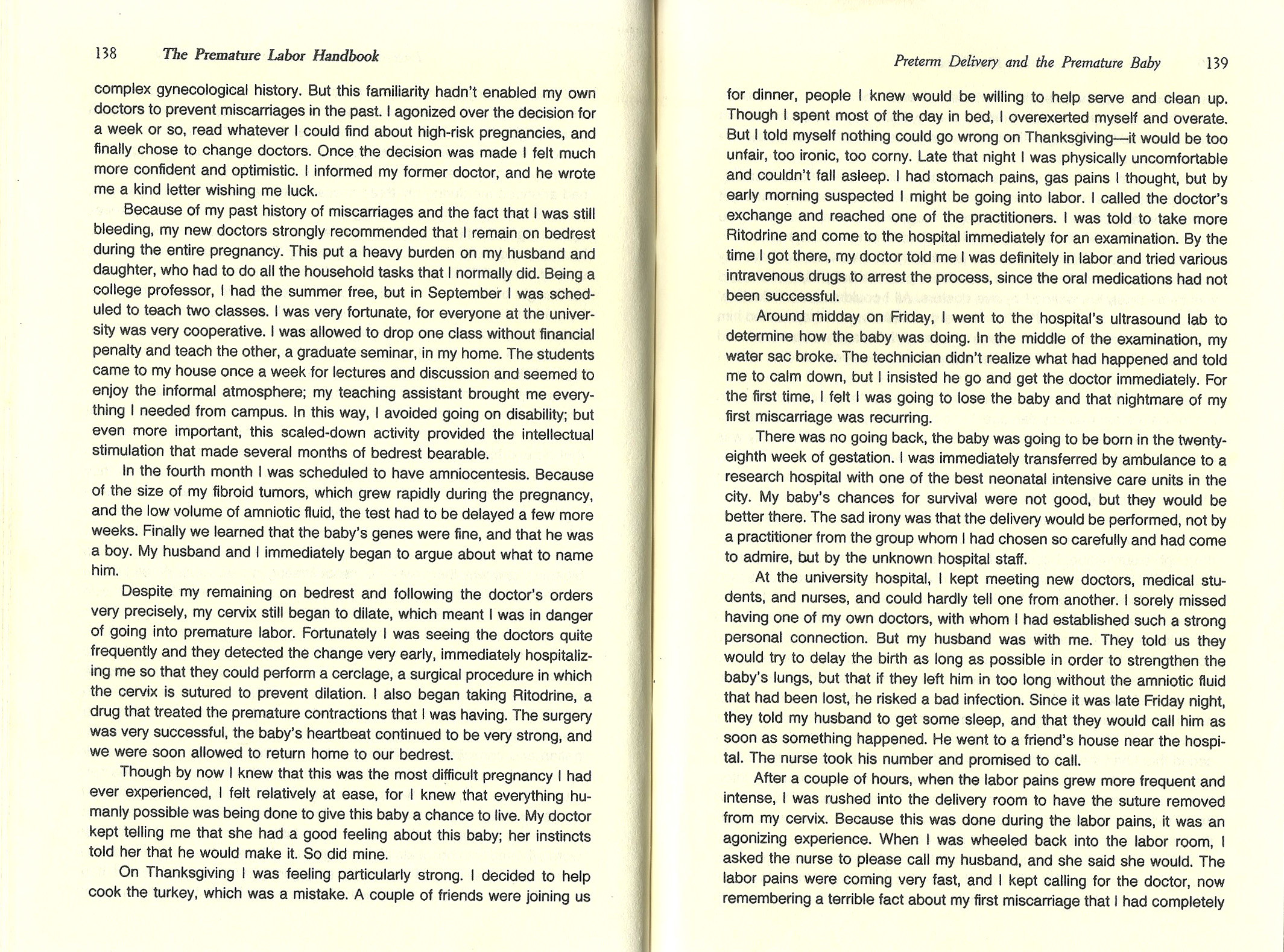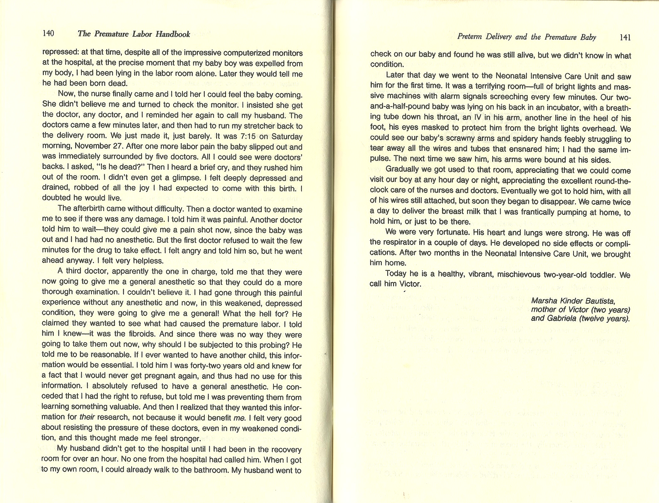 Marsha Kinder Bautista (professor) with children Gabriela (age twelve years), Victor (age eighteen months), and husband Nicolás. Victor was born at twenty-eight weeks of gestation after Marsha had undergone bedrest throughout her pregnancy, which was complicated with uterine fibroids, vaginal bleeding, a weakened cervix (a cerclage was placed), and premature labor (she received medication).
