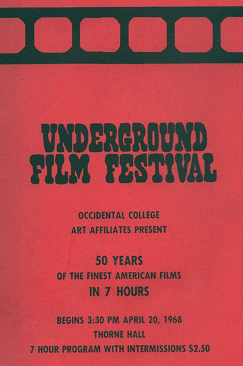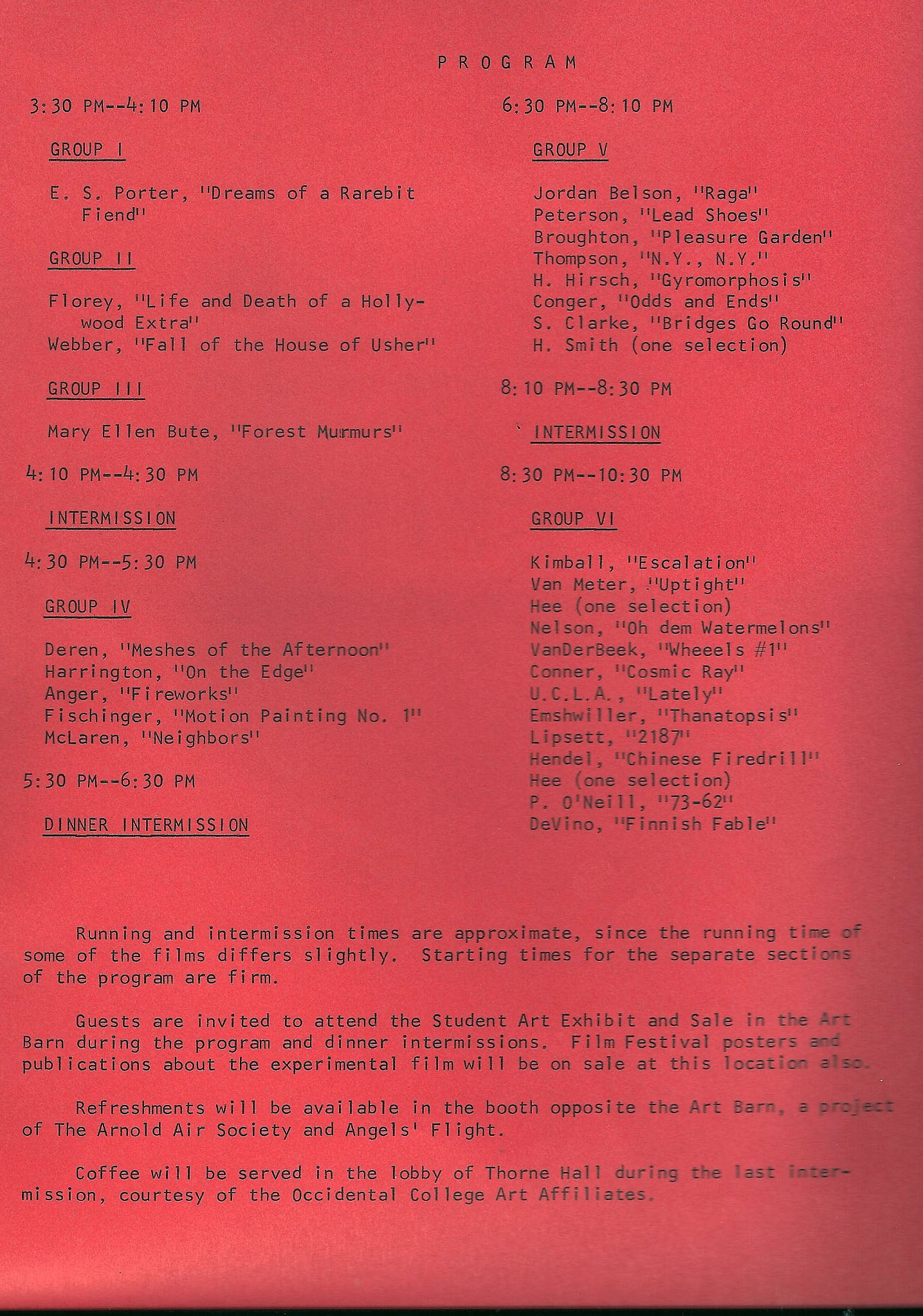 Together in 1967 we introduced the first film course at Oxy, which we took turns teaching. And in April 68, we co-hosted the Yankee Underground Film Festival, which ran for seven hours with a dinner break, and both wrote essays for the catalogue. Immediately popular, our class drew over a hundred students, yet we still had them make 8mm or Super 8 films and usually showed the most radical films we could find. We realized we needed someone to teach film production, but there was no salary line. So we got Oxy to hire independent filmmaker Chick Strand as an Audio Visual technician. It took her merely a few hours to train a student to do that job so that she could focus on showing students how to make movies. Of course, everyone loved her, especially Bill and I, and once the college saw what a great job she was doing, she was hired by the Theater Department. Bill felt we now had the essential assets for a film department.