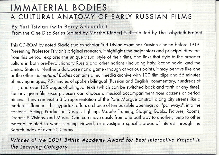 Barry was a friend of mine, the father of one of my son’s best friends. Once he heard about our Cine-Disc Series, he volunteered to be part of it. He ended up programming not only my own CD-ROM version of Blood Cinema (the first scholarly CD-ROM in English language film studies) but also the next work in the series, Yuri Tsivian’s Immaterial Bodies: A Cultural Anatomy of Early Russian Films where he collaborated on the interface design. Immaterial Bodies received the 2001 British Academy Award for the Best Interactive Project in the Learning Category.