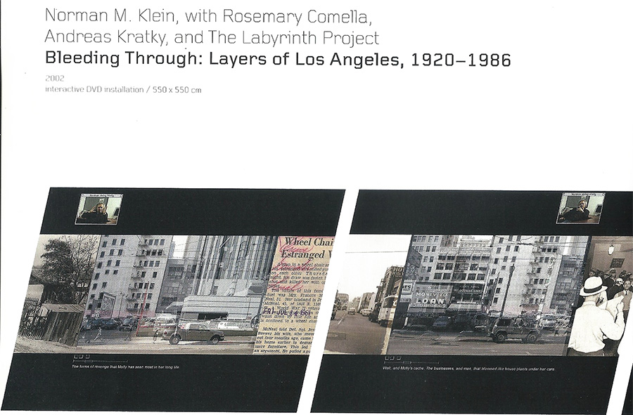In 2001, when pioneering new media artist Jeffrey Shaw was still founding director of the ZKM Institute for Visual Media in Karlsruhe, Germany, he proposed an exciting co-production--between ZKM and The Labyrinth Project—focused on Los Angeles. This interactive work was to be based on The History of Forgetting: Los Angeles and the Erasure of Memory, a book by cultural critic Norman M. Klein. The adaptation was to be co-directed by Labyrinth’s Rosemary Comella and ZKM’s Andreas Kratky, two brilliant interface designers, with Shaw and me functioning as co-producers. What resulted was Bleeding Through Layers of Los Angeles, 1920-1986, an interactive DVD-Rom that was released with a booklet containing Klein’s fictional version of the story and brief essays by Comella, Kratky, Shaw and me. In 2002, when Shaw collaborated with Peter Weibel on curating a large scale exhibition at ZKM called Future Cinema: The Cinematic Imaginary after Film, he included Bleeding Through in the show and two other works by Labyrinth presented as installations—Tracing the Decay of Fiction: Encounters with a Film by Pat O’Neill and The Danube Exodus: The Rippling Currents of the River, a collaboration with Hungarian filmmaker Péter Forgács. All three projects are also featured in the catalog, along with essays by Klein (The Future of the Cinematic City) and by me (Designing a Database Cinema).